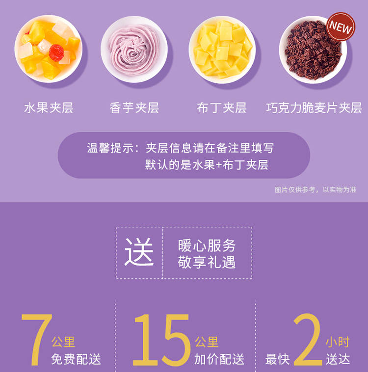 夹层四选二:水果夹层、香芋夹层、布丁夹层、巧克力脆麦片夹层