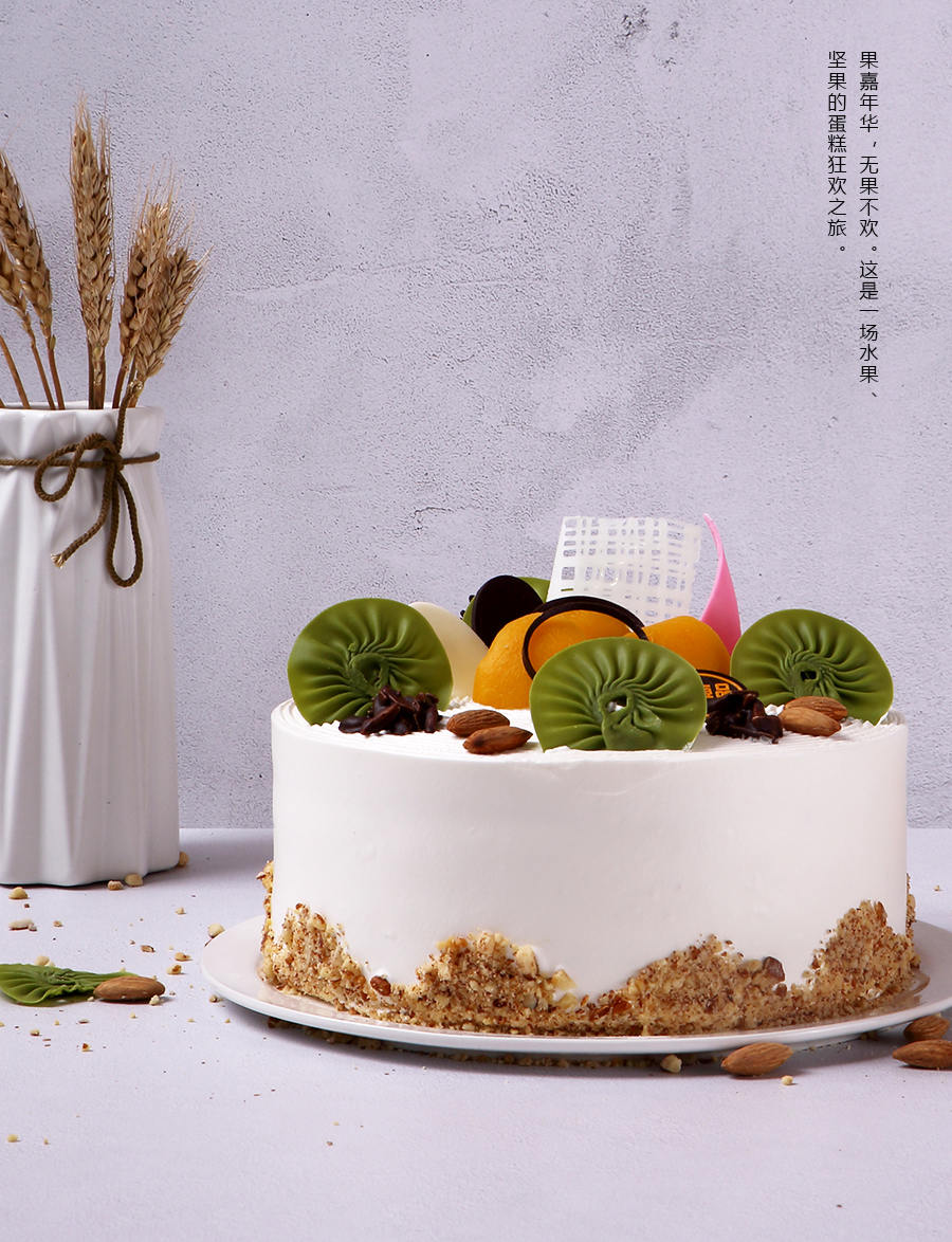 上缀水果、巧克力拉丝,香脆的果仁围绕,简洁时尚。