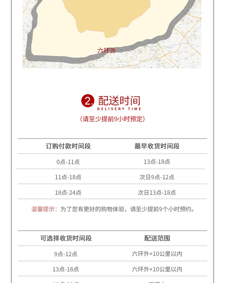 上海419论坛 提交订单时您可以选择上午(8:30-12:00)、下午(12:00-18:00)、晚上(18:00-21:00)三个时段;如果对配送时间点有特别需求,您可以选择定时服务。特别提示:如果下单时间距离所选时段少于3小时,您所选时段无法满足的情况下,将尽量在您付款后3小时内送到。