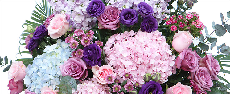 开业花篮:紫色紫罗兰9枝,粉色绣球2枝,蓝色绣球3枝,粉佳人玫瑰12枝,紫玫瑰15枝,紫色桔梗6枝,紫色小菊7枝,搭配龟背叶、散尾葵尤加利适量(紫罗兰花期为12-4月,其他月份用浅紫色金鱼草/浅紫色桔梗/浅紫色风铃花等相似线状花材替代)