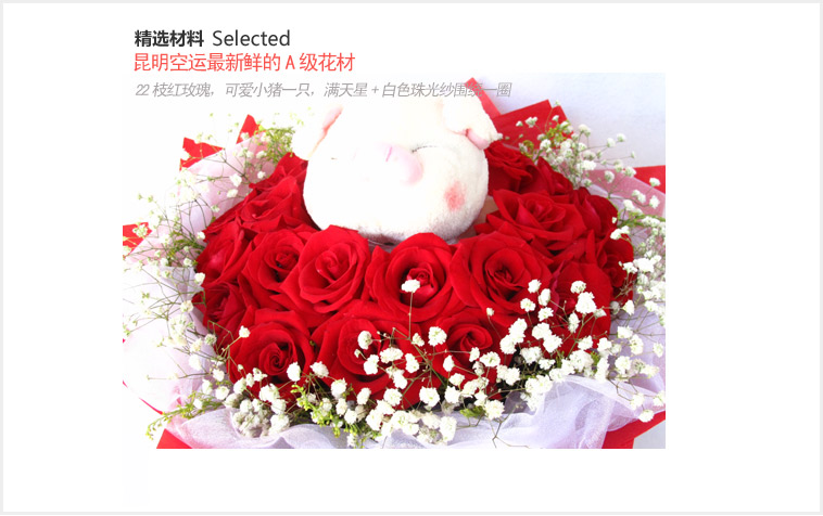 22枝红玫瑰,可爱小猪一只(小猪高约16-18CM),满天星+白色珠光纱围绕一圈