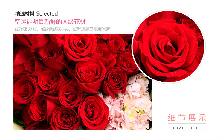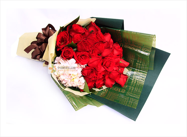 上海419论坛红玫瑰33枝,浅粉色绣球一枝,绿叶适量至花束饱满