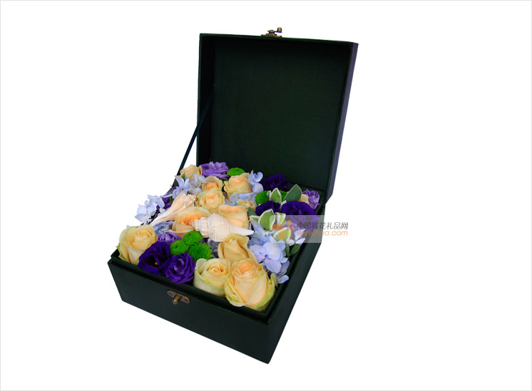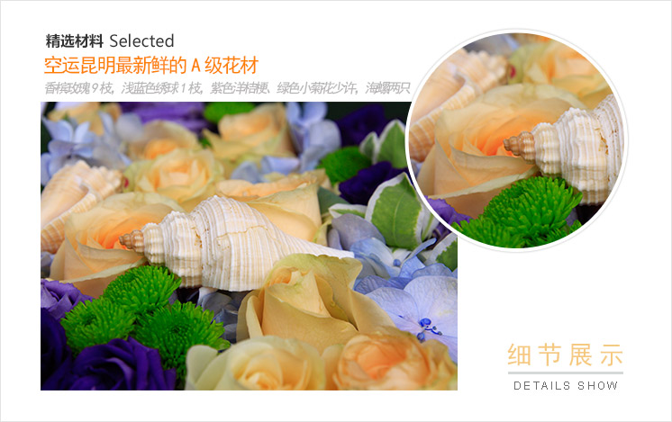 香槟玫瑰9枝,浅蓝色绣球1枝,紫色洋桔梗、绿色小菊花少许,海螺两只