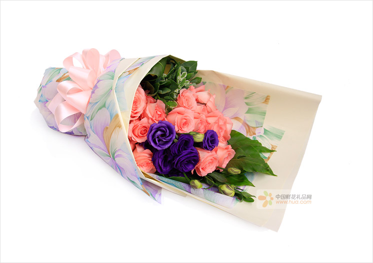 粉玫瑰19枝,紫色洋桔梗、叶上花少许,山苏叶6片