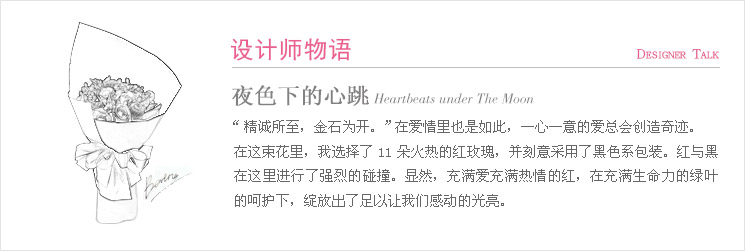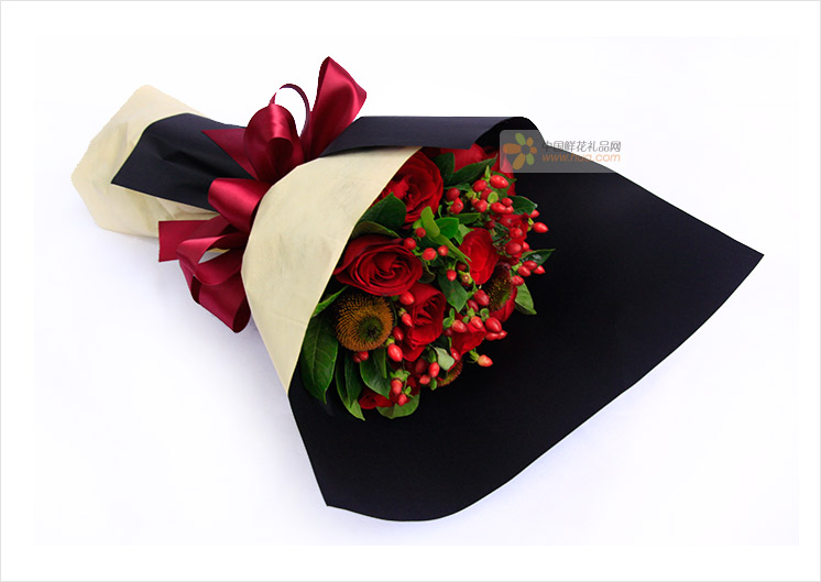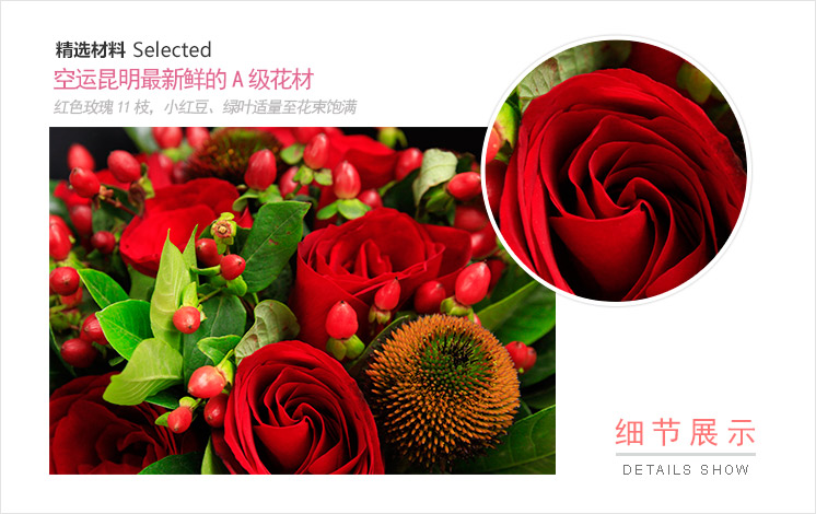 红色玫瑰11枝,小红豆、绿叶适量至花束饱满(如当地红豆缺货,用相思梅等其他寓意相近配材替代。)