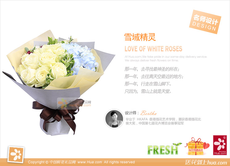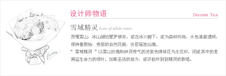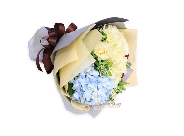 雪山白玫11支,浅蓝色绣球1枝,叶上花适量至花束饱满