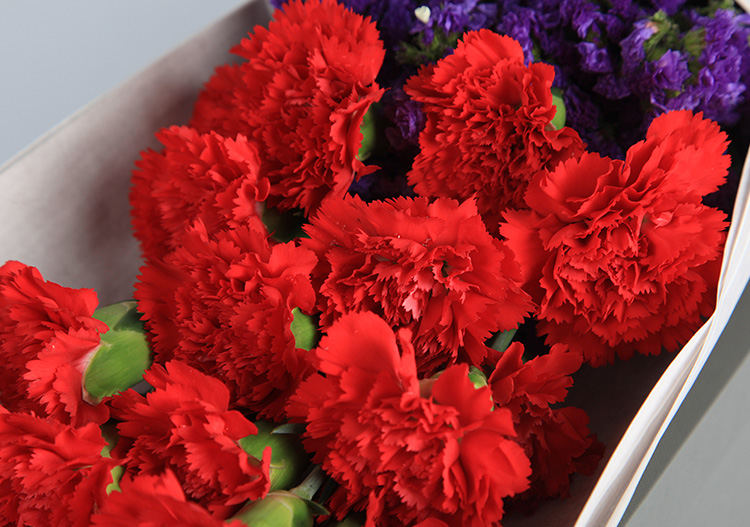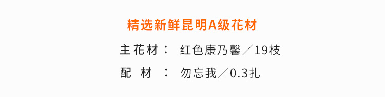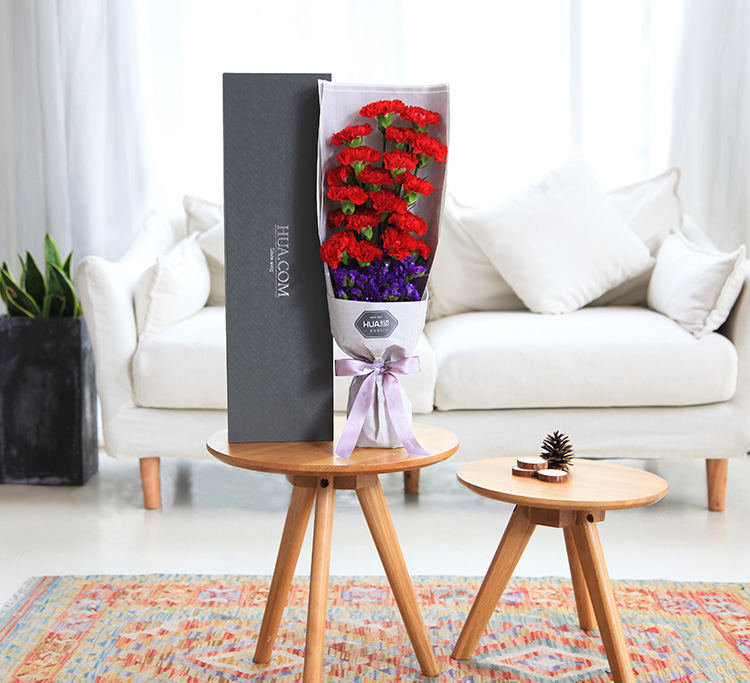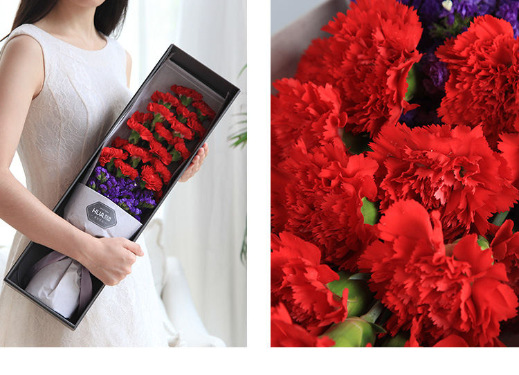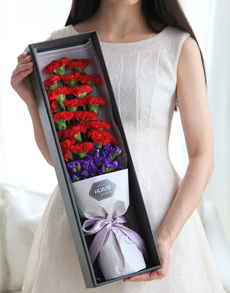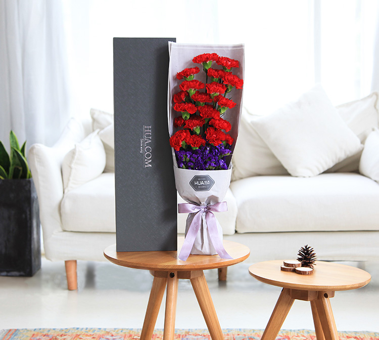 高档礼盒装鲜花:红色康乃馨19枝,勿忘我3枝