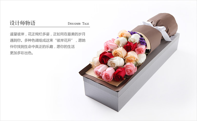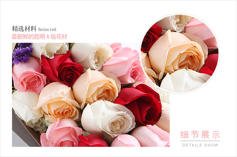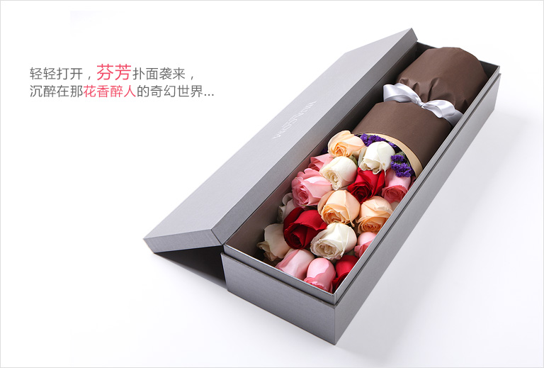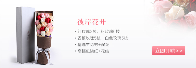 上海419论坛高档礼盒装鲜花:红玫瑰3枝,粉玫瑰6枝,香槟玫瑰5枝,白色玫瑰5枝,勿忘我适量