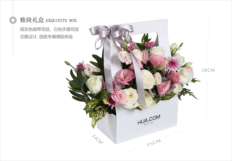 上海419论坛银灰色缎带花结、白色手提花篮
