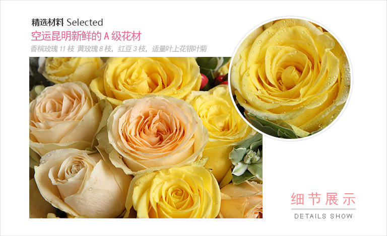 香槟玫瑰11枝,黄玫瑰8枝,红豆3枝,叶上花6枝,银叶菊2枝