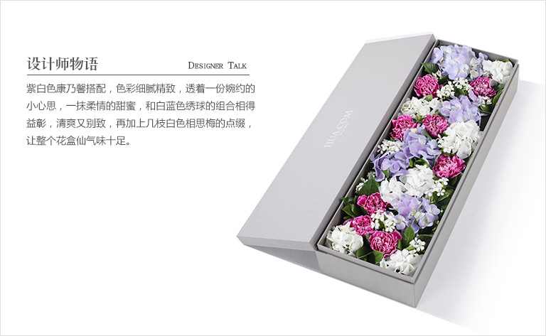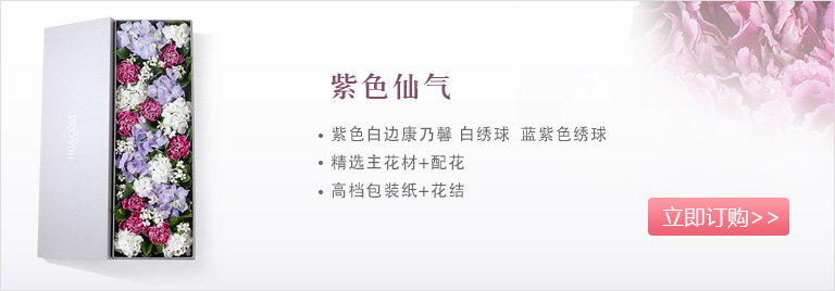 上海419论坛紫色白边康乃馨8枝、白绣球1枝、蓝紫色绣球1枝、白色相思梅5枝、栀子叶0.5扎