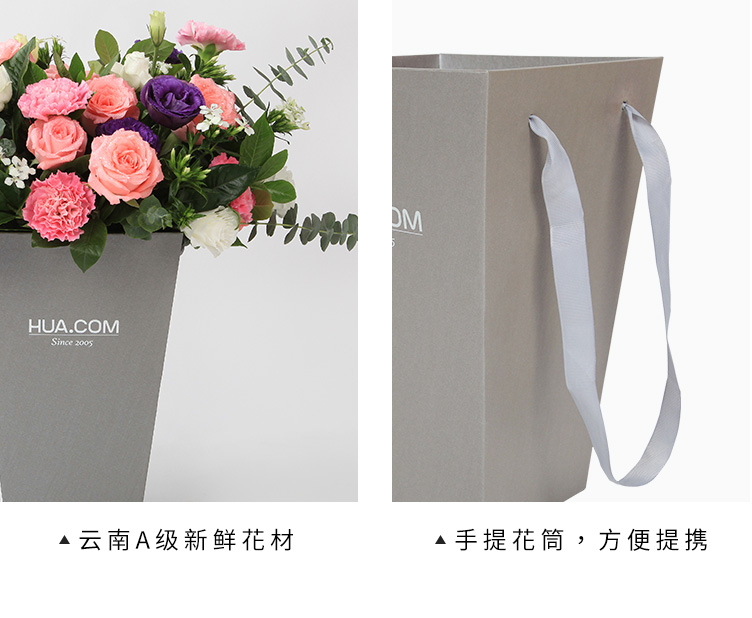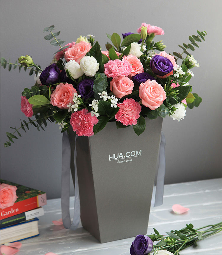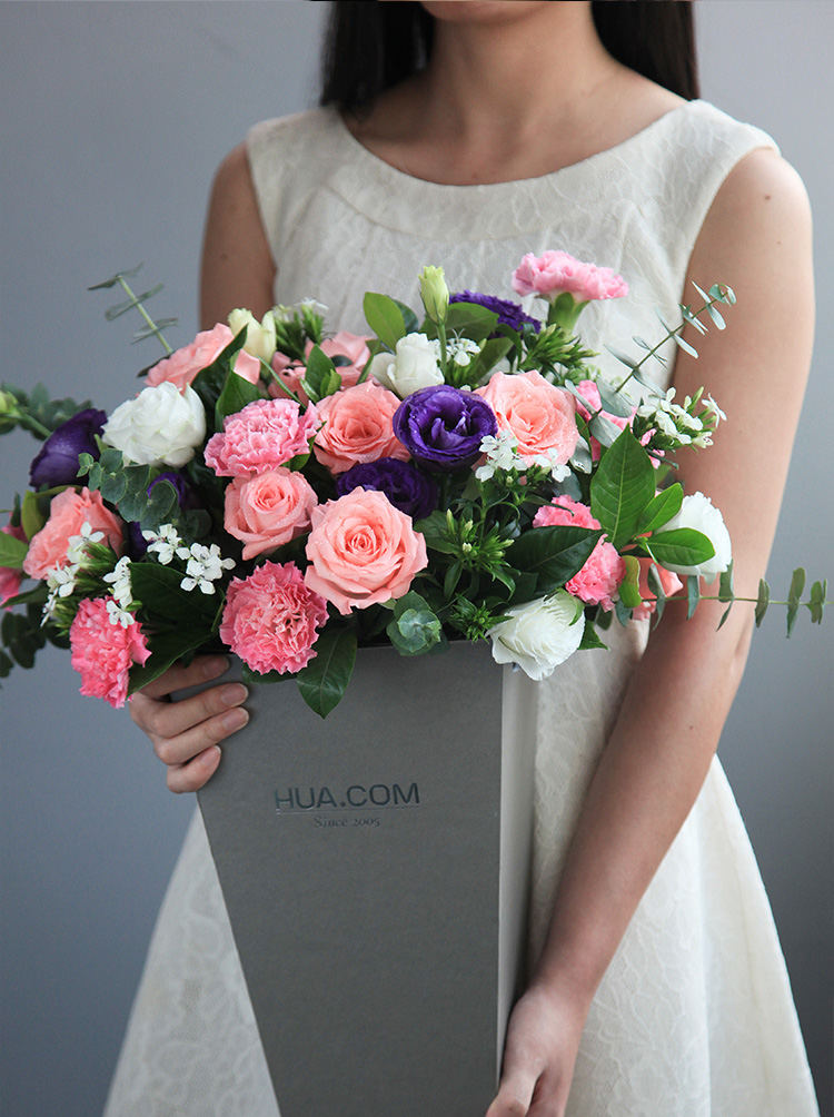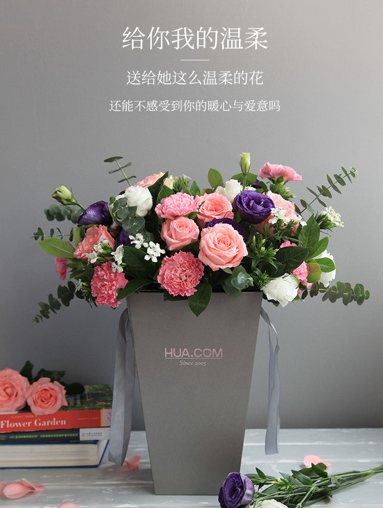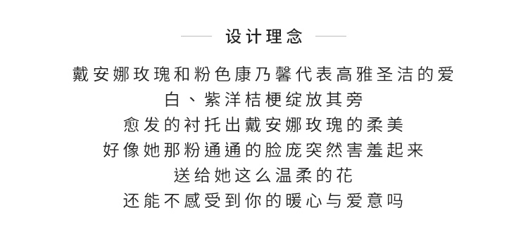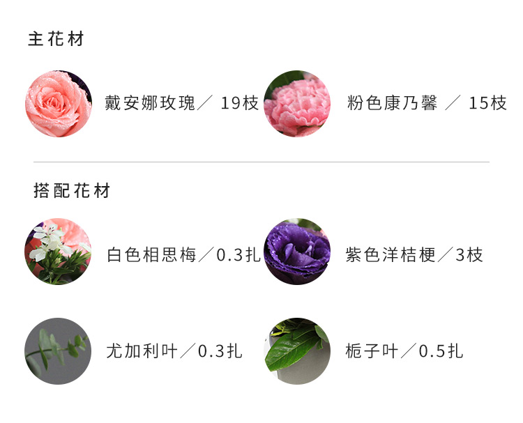 戴安娜玫瑰19枝,粉色康乃馨15枝,紫色洋桔梗3枝,白色洋桔梗5枝,白色相思梅3枝,栀子叶5枝,尤加利叶3枝