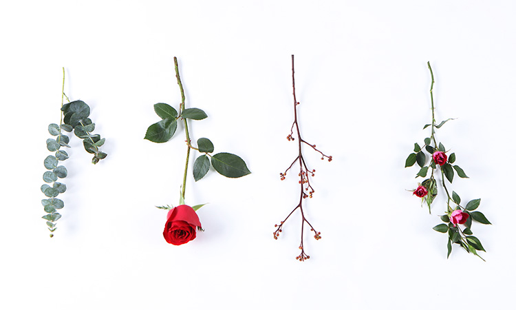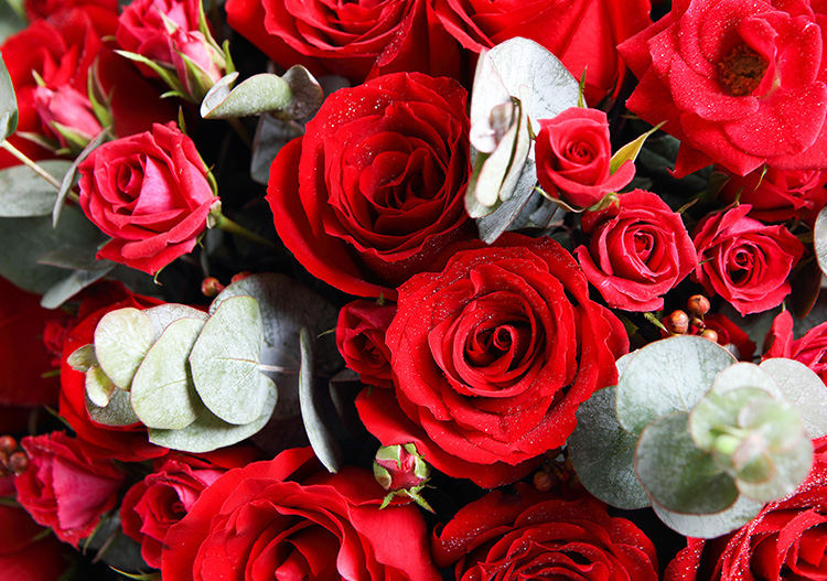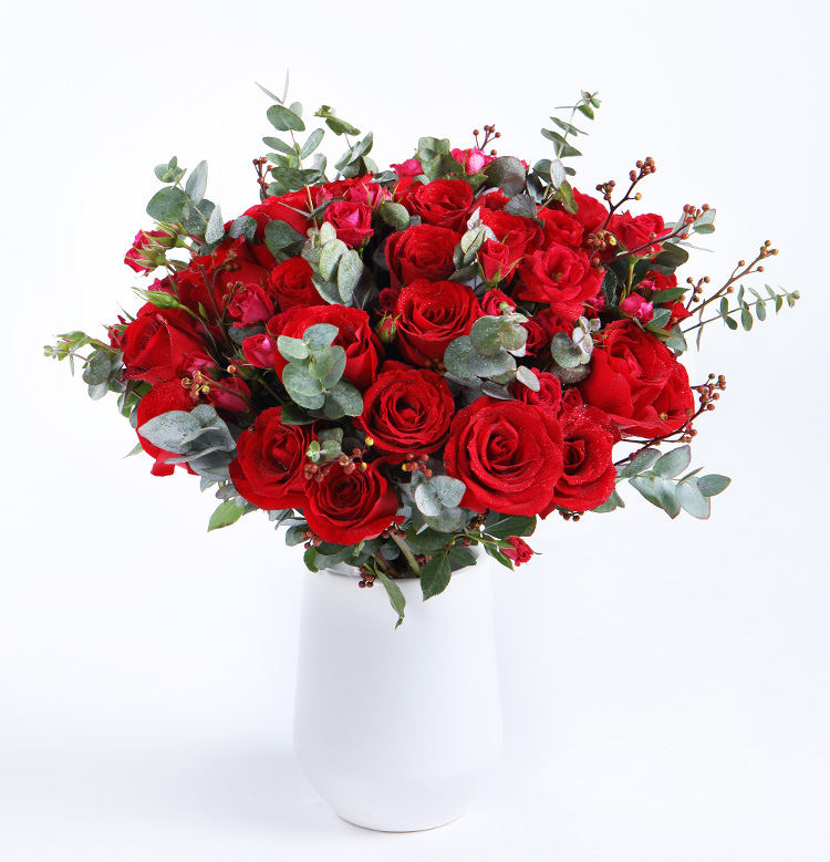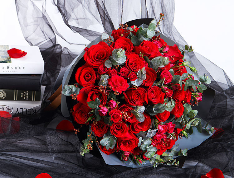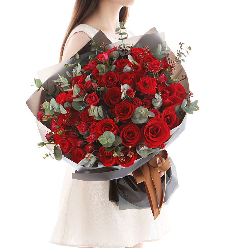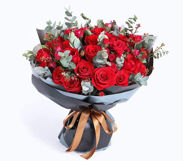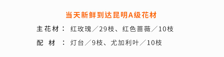红玫瑰29枝,红色蔷薇10枝,灯台9枝,尤加利叶10枝