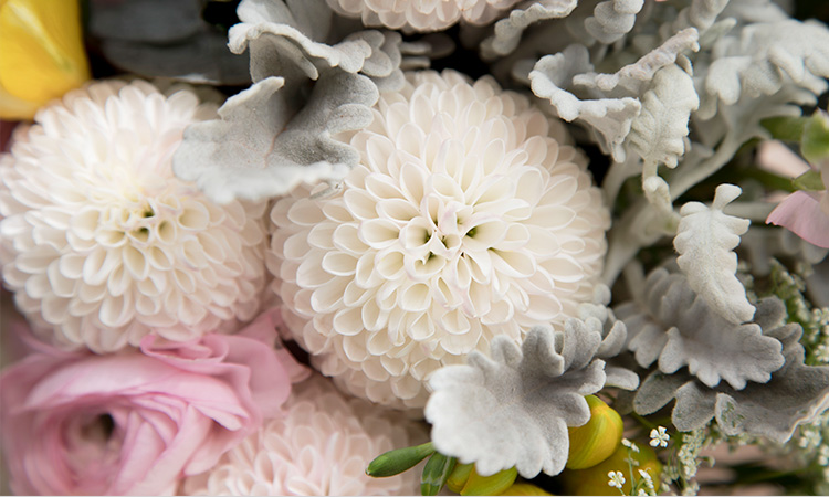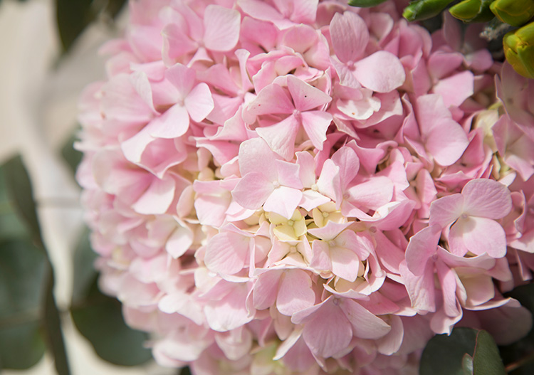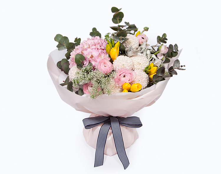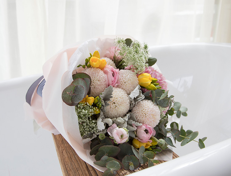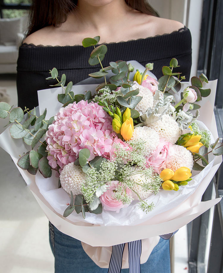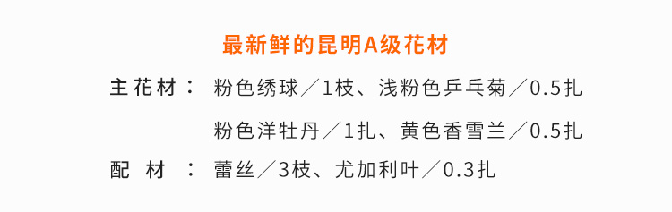 粉色洋牡丹1扎、粉色绣球1枝、浅粉色乒乓菊0.5扎、蕾丝3枝、黄色香雪兰0.5扎、尤加利叶0.3扎