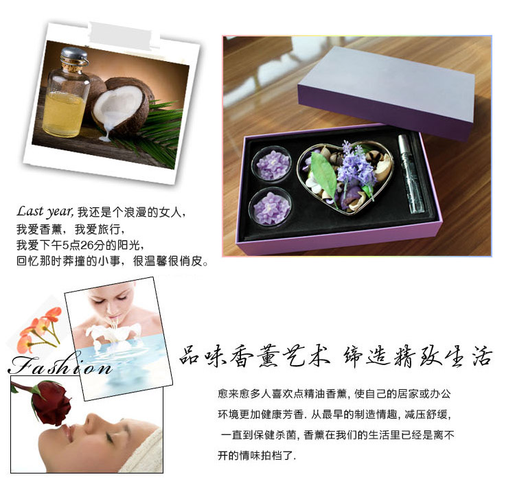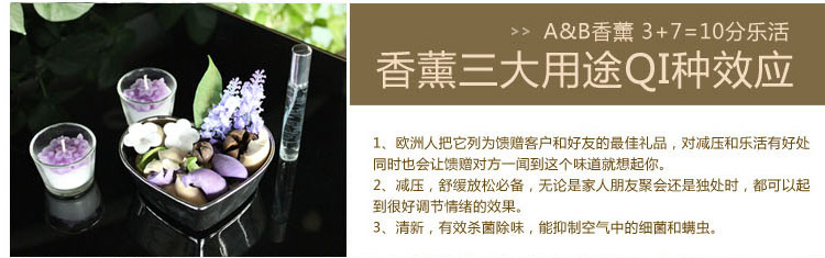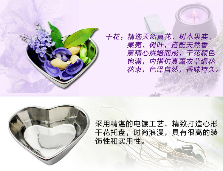 立减8元套装组成:55×45mm香薰雕刻杯蜡两支、天然香薰植物干花+心形电镀陶瓷盘、20毫升香薰喷雾一支