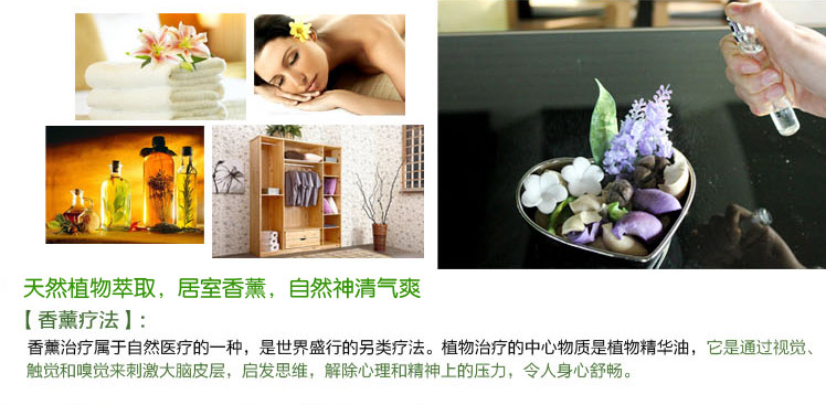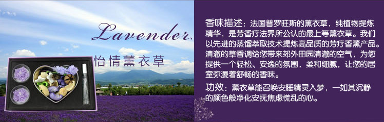 香味描述: 法国普罗旺斯的薰衣草,纯植物提炼精华,是芳香疗法界所公认的最上等薰衣草。清澈的草香调给您带来郊外田园清澈的空气,为您提供一个轻松、安逸的氛围,柔和细腻,让您的居室弥漫着舒畅的香味。