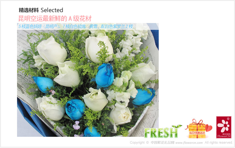 上海419论坛5枝蓝色妖姬(昆明产),7枝白色玫瑰,黄莺,配白色紫罗兰2枝(如无紫罗兰,用其他白色系配花替代)