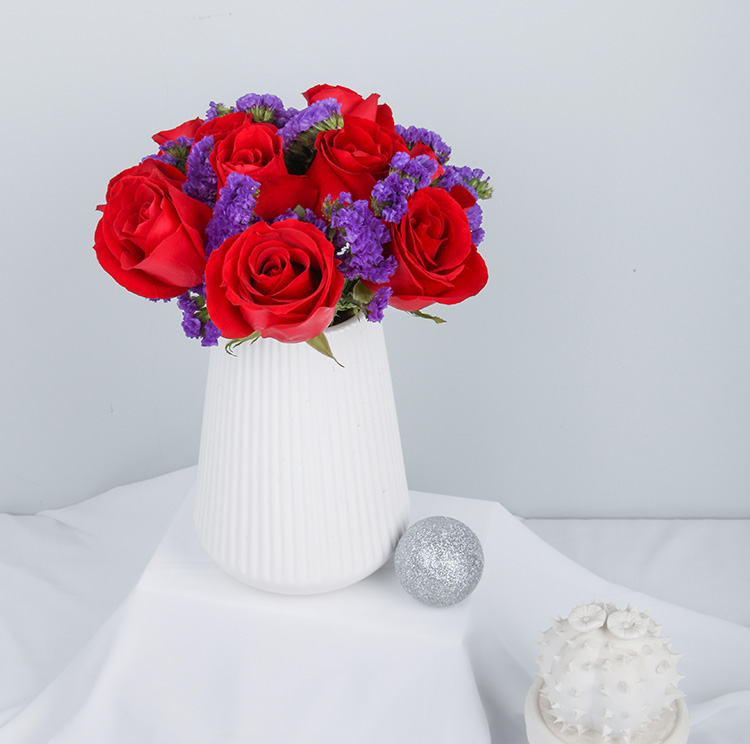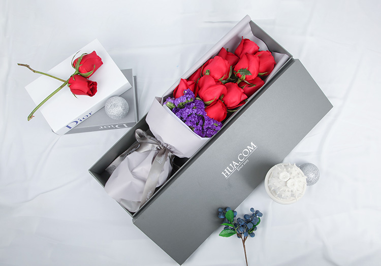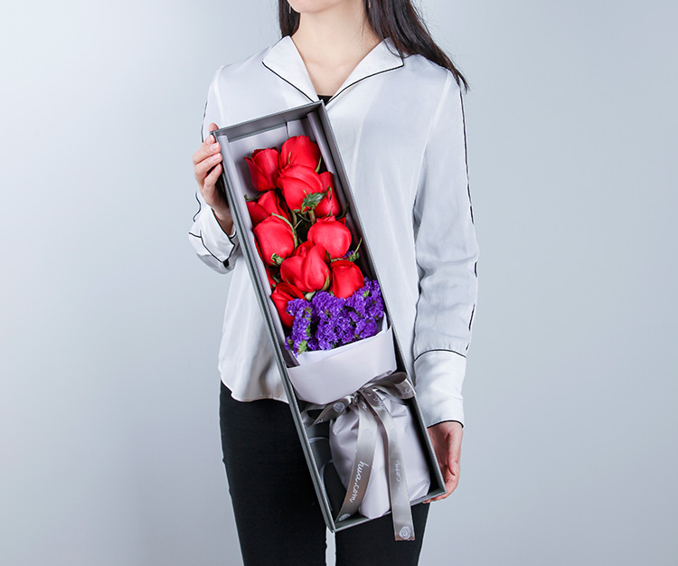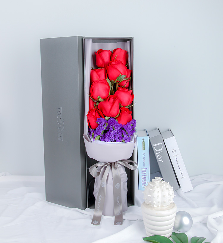 高档礼盒装鲜花:卡罗拉红玫瑰11枝,深紫色勿忘我适量