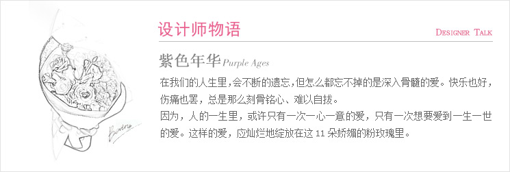 11枝粉玫瑰,浅蓝色绣球1枝,紫色洋桔梗、银叶菊适量。