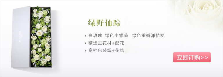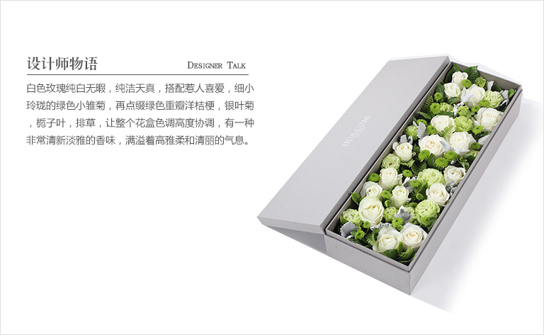 白玫瑰16枝、绿色小雏菊4枝、绿色重瓣洋桔梗3枝、银叶菊3枝、栀子叶2枝、排草10枝