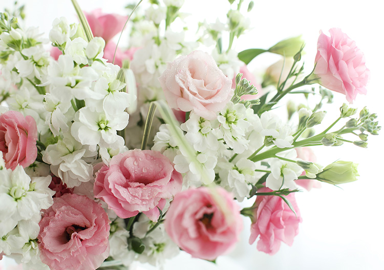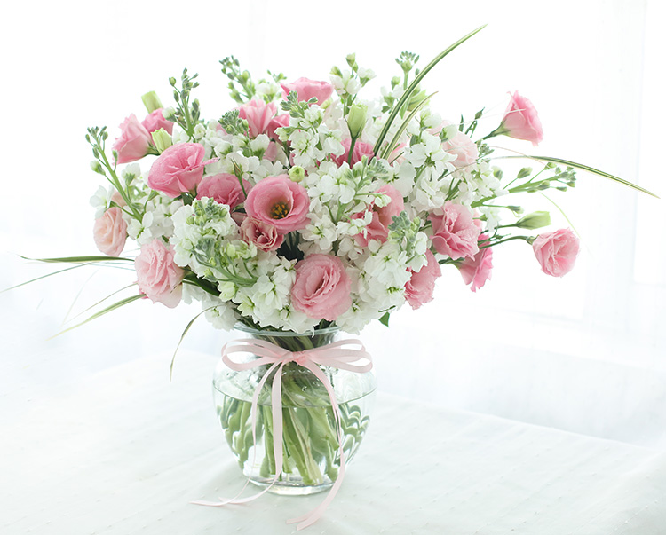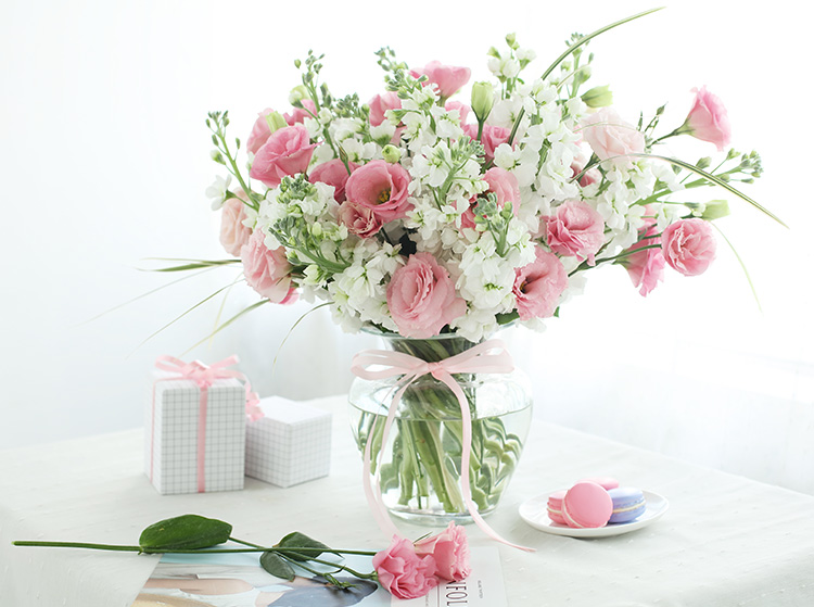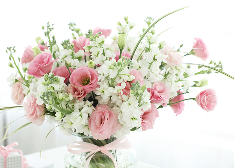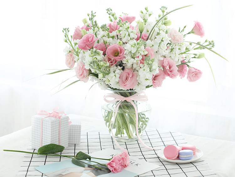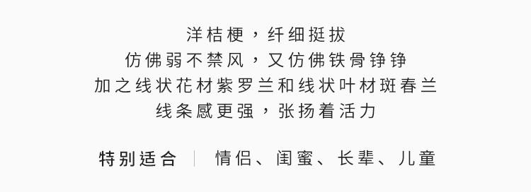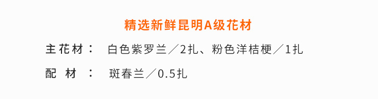 白色紫罗兰2扎(紫罗兰花期为12-4月,其他月份用白色金鱼花或者白色桔梗替代)、粉色洋桔梗1扎,斑春兰5枝(斑春兰如缺货可用尤加利替代)