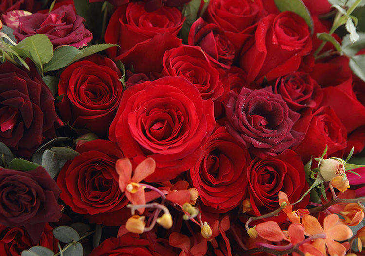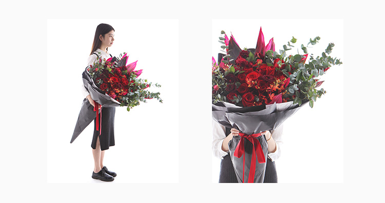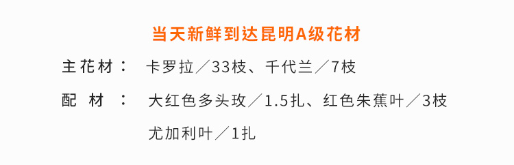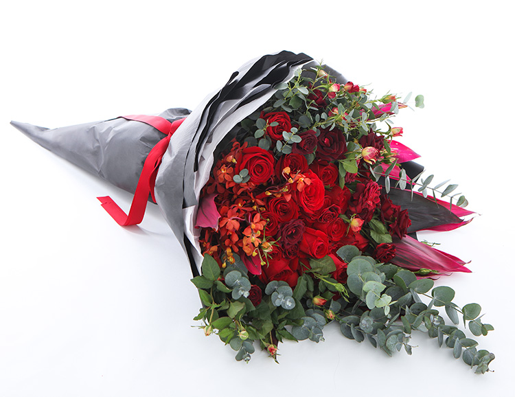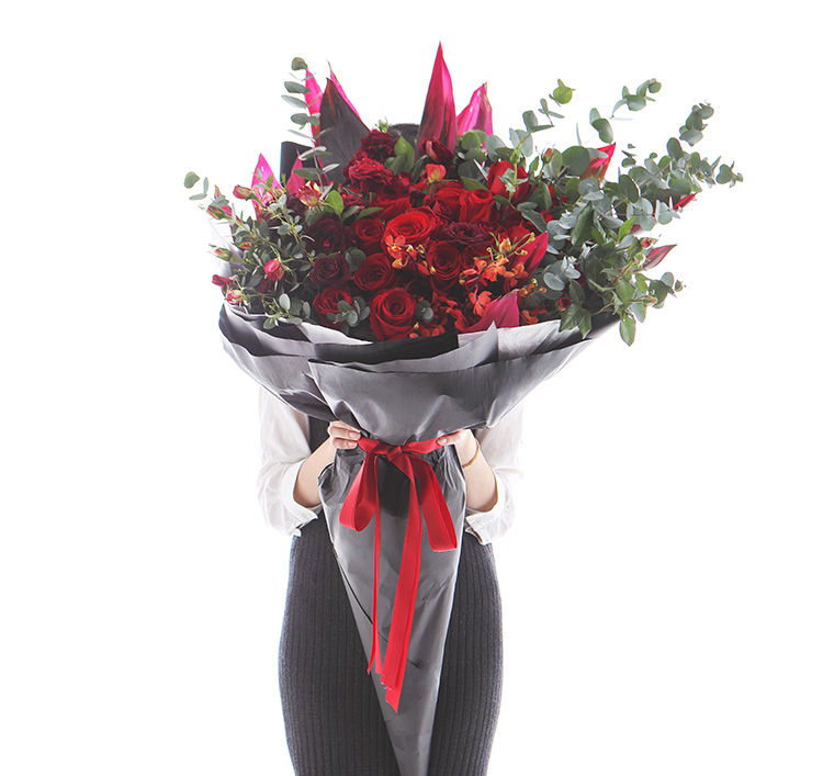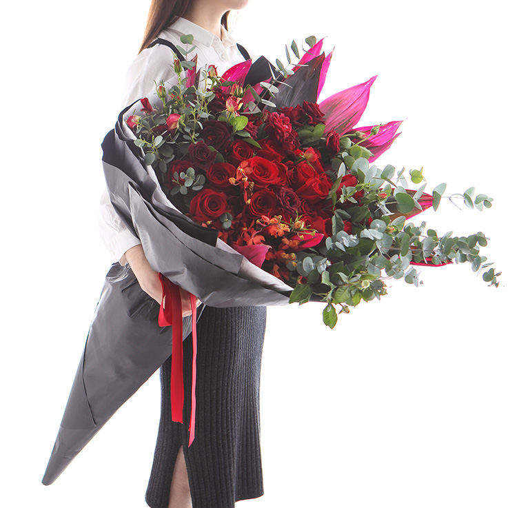 上海419论坛卡罗拉红玫瑰33枝、红色朱蕉叶3枝、千代兰7枝、大红色多头玫15枝、尤加利叶10枝,花束长达1.2m~1.3m