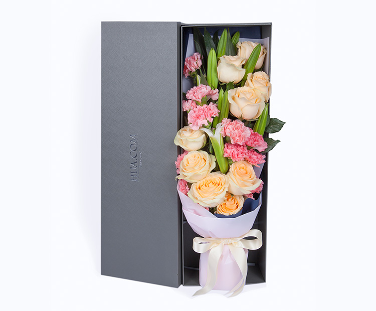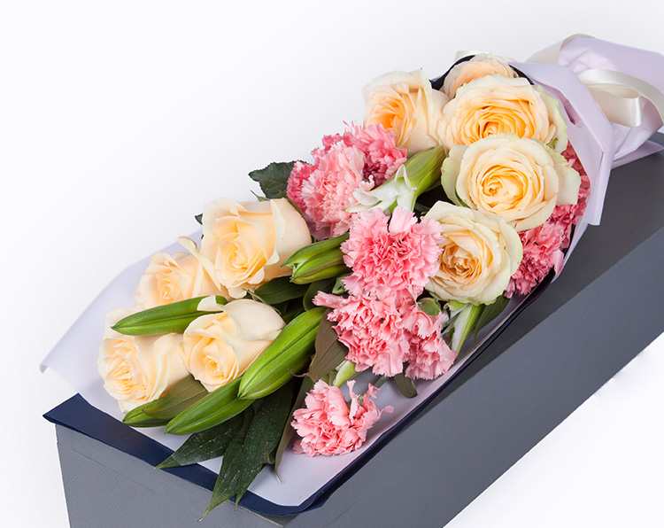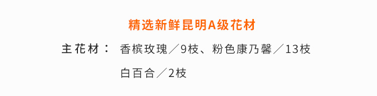 上海419论坛香槟玫瑰9枝、多头白百合2枝(3-5头/支)、粉色康乃馨13枝