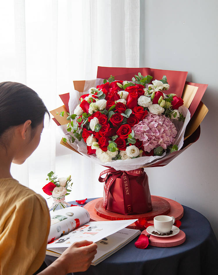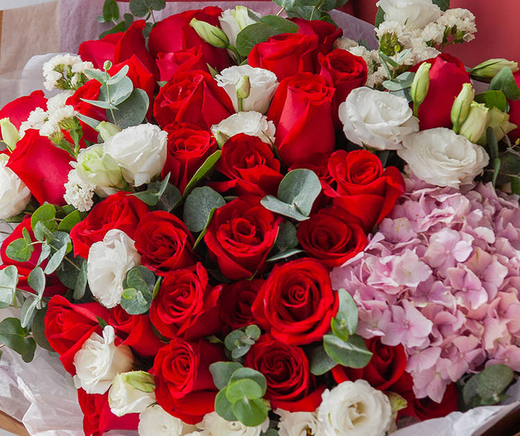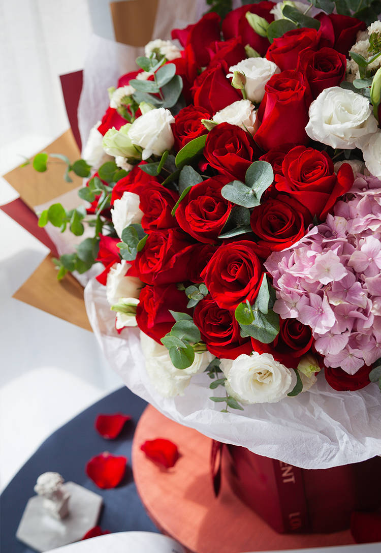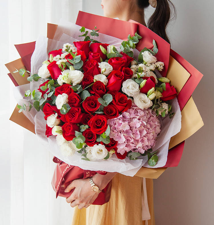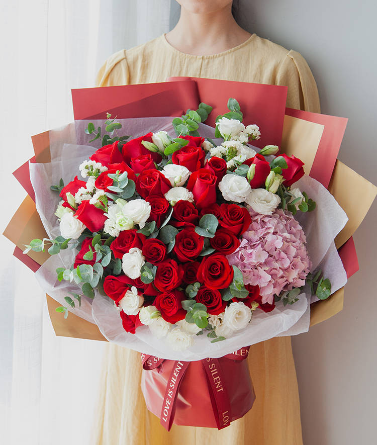 韩式花束系列:卡罗拉红玫瑰33枝、白色洋桔梗7枝、粉色绣球1枝、白色勿忘我5枝,尤加利10枝