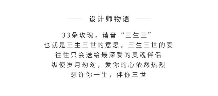 立减8元上海419论坛以爱情主题的红玫瑰,搭配象征白色无暇的桔梗以及充满浪漫主义的粉色绣球为设计主题,打造全新韩式系列:33朵玫瑰,谐音“三生三”,也就是三生三世的意思,三生三世的爱,往往只会送给最深爱的灵魂伴侣。纵使岁月匆匆,爱你的心依然热烈,想许你一生,伴你三世