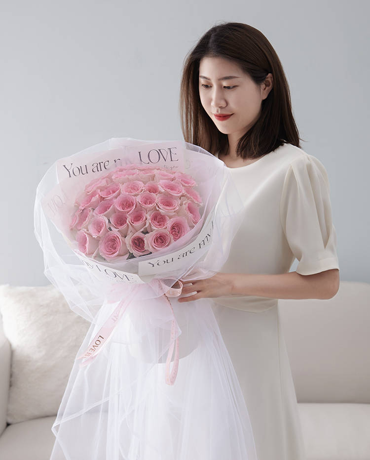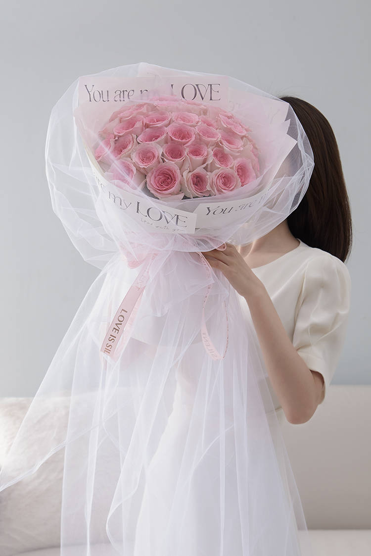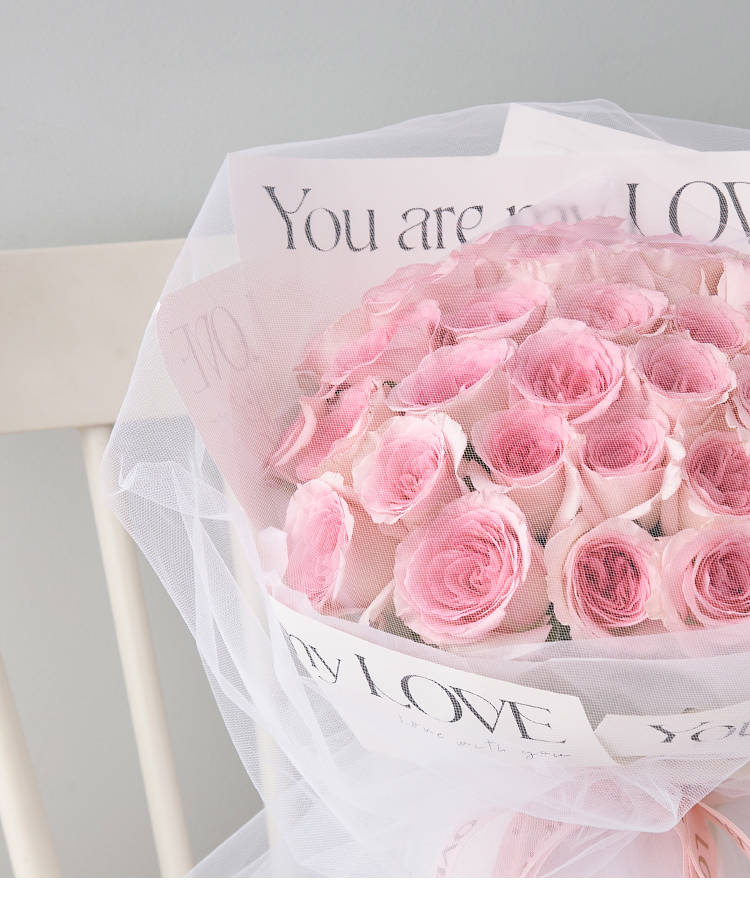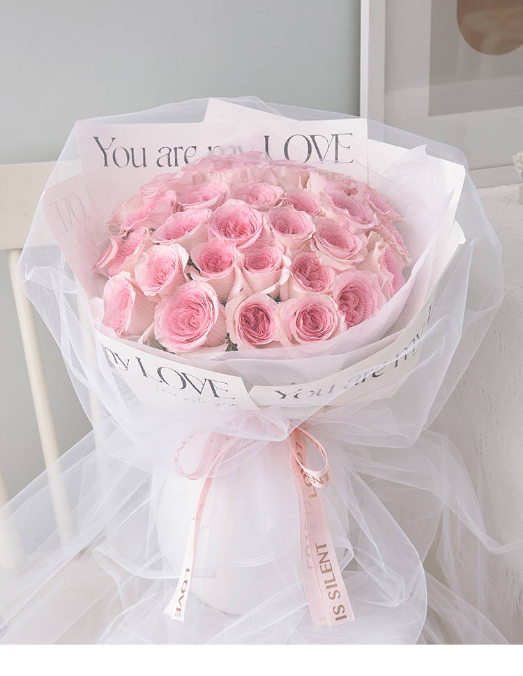 白色小号英文插画纸(You are my love)10张、仙女纱2米、白色雪梨纸2张、粉色罗纹烫金丝带2米