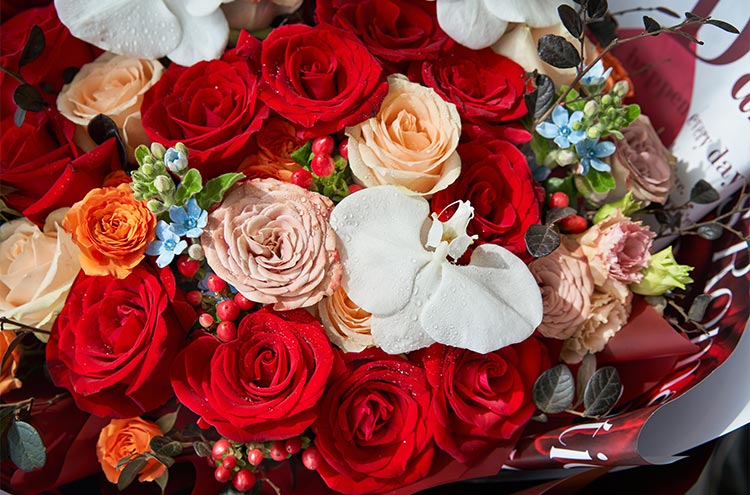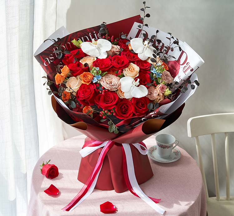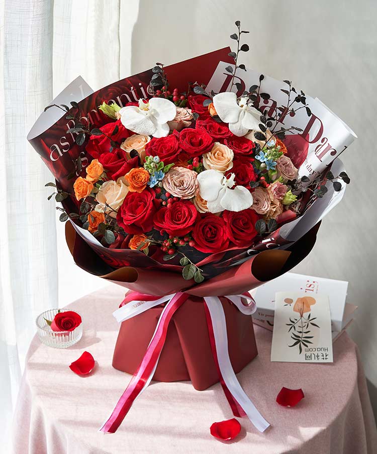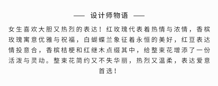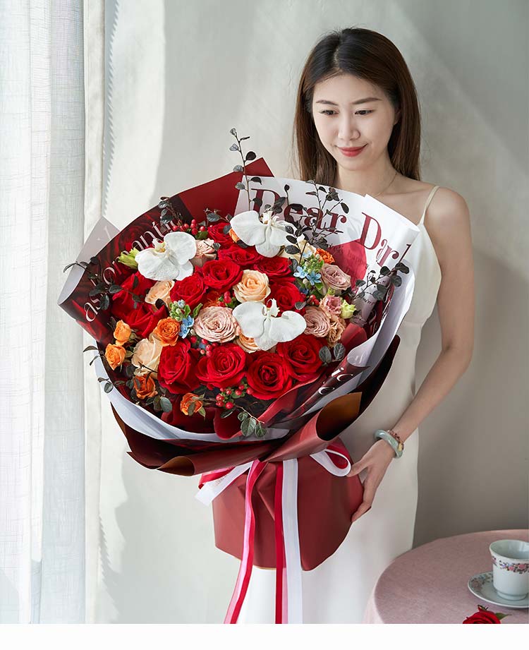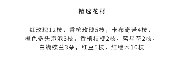 上海419论坛红玫瑰12枝,香槟玫瑰5枝,卡布奇诺玫瑰4枝,橙色多头泡泡3枝(6头以上/枝),香槟桔梗2枝(3头以上/支),蓝星花2枝,白蝴蝶兰3朵,红豆5枝(3头以上),红继木10枝(缺货则用小叶尤加利叶或者其他类似线状叶材代替)